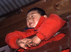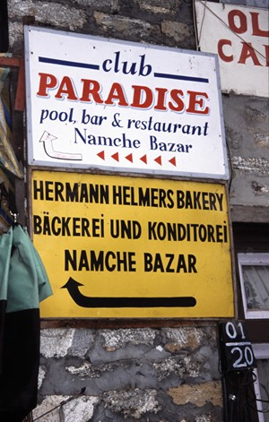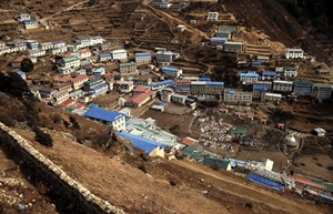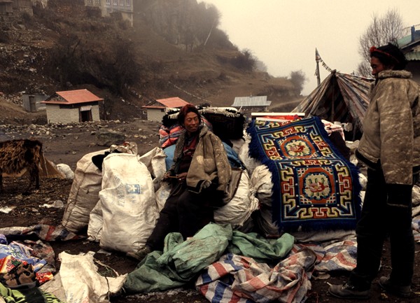 NAMCHE BAZAR ist Handelsplatz für alles, auch für tibetische Teppiche, die hier von 2 Kampas (erkennbar an der roten Haarbinde) angeboten werden. |