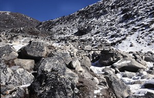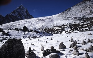 ... nach einem Fußweg über eine Brücke in der Endmoräne des Khumbu-Gletschers (20 m oberhalb des Mont Blanc) erreichten wir das "Memorial to Those Who Have Died on Everest", und ... |