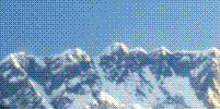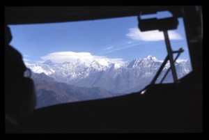 Der Flughafen Lukla liegt auf 2800 m Meereshöhe, die Landebahn beginnt an einem steilen Talrand und endet an einem Bergrand, oder zumindest kurz davor. Das Bild entsand kurz vor der Landung aus dem Cockpit und der Blick geht auf die "Wanderwege der nächsten Tage, links unter den Wolken die Gipfelpyramide des Everest: Peak XV für Landvermesser. |