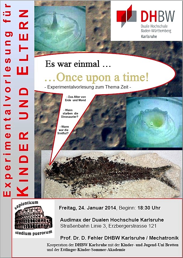 Datum: Freitag, den 24. Januar 2014, 18:30 Uhr Ort: Audimax der DHBW Karlsruhe Zielgruppe: Vorlesung fuer Kinder und Eltern Natuerlich sind auch Enkel und Grosseltern erlaubt, genauso Leihkinder und Leiheltern, also eigentlich fast alle Kombinationen - aber 2 Generationen sollten es schon sein. Alterskontrollen gibt es nicht, der Verwandtschaftsgrad wird auch nicht ueberprueft, aber Spass an Naturwissenschaften sollte man haben. Poster-Download 1,5 MB , pdf-Datei fuer DIN A 0, kann nach unten skaliert werden! |