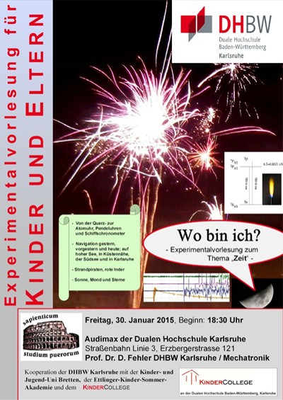 Datum: Freitag, den 30. Januar 2015, 18:30 Uhr Thema: "Wo bin ich?" - Zeitmessung Ort: Audimax der DHBW Karlsruhe Zielgruppe: Vorlesung fuer Kinder und Eltern Natuerlich sind auch Enkel und Grosseltern erlaubt, genauso Leihkinder und Leiheltern, also eigentlich fast alle Kombinationen - aber 2 Generationen sollten es schon sein. Alterskontrollen gibt es nicht, der Verwandtschaftsgrad wird auch nicht ueberprueft, aber Spass an Naturwissenschaften sollte man haben. Veranstalter: DHBW Karlsruhe mit den Kinder-Unis aus Bretten und Ettlingen (EKSA) und dem neu gegruendeten