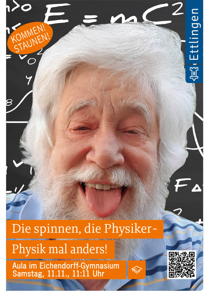 Datum: Samstag, den 11. November 2023, vormittags 11:11 Uhr bis 12:41 Uhr Ort: Eichendorff-Gymnasium, Goethestraße 2, Aula Zielgruppe: Vorlesung fuer Kinder und Eltern Anmeldung über das bewährte EKSA-Portal auch wenn jetzt gerade keine Ferien sind. Thema: "Die spinnen, die Physiker!" - Mit seltsamen Experimenten am 11.11. die Natur erkunden - Natuerlich sind auch Enkel und Grosseltern erlaubt, genauso Leihkinder und Leiheltern, also eigentlich fast alle Kombinationen - aber 2 Generationen sollten es schon sein. Alterskontrollen gibt es nicht, der Verwandtschaftsgrad wird auch nicht ueberprueft, aber Spass an Naturwissenschaften sollte man haben. Veranstalter: EKSA Ettlingen Amt für Bildung, Jugend, Familie und Senioren der Stadt Ettlingen Poster-Download 1,7 MB , pdf-Datei fuer DIN A 0, kann nach unten skaliert werden! ______________________________ |