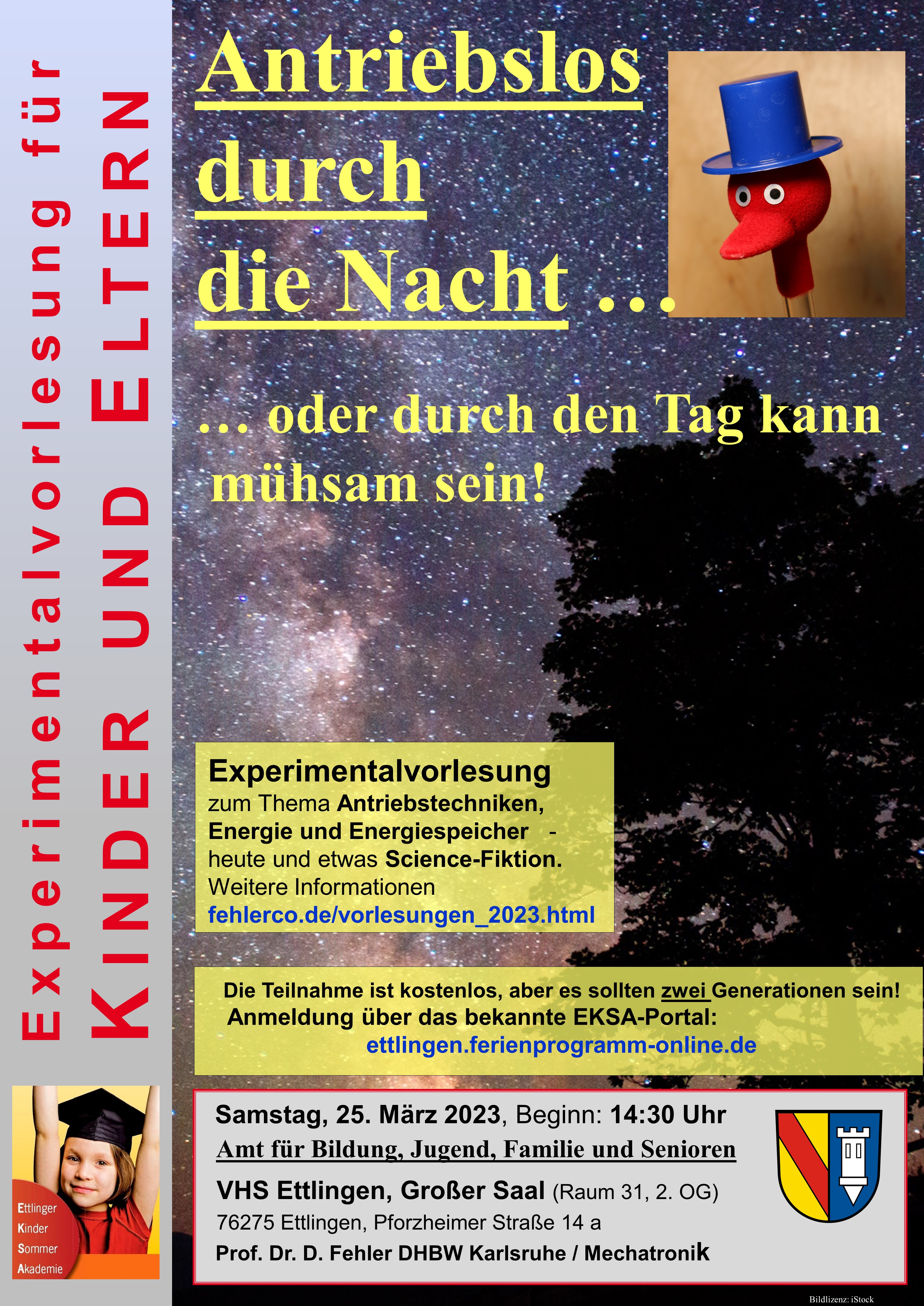 Datum: Samstag, den 25. März 2023, nachmittags 14:30 Uhr bis 16:00 Uhr Ort: VHS Ettlingen, Pforzheimer Straße 14 a, Großer Saal Zielgruppe: Vorlesung fuer Kinder und Eltern Anmeldung über das bewährte EKSA-Portal Alles belegt! auch wenn jetzt gerade keine Ferien sind. Thema: "Antriebslos durch die Nacht ..." Antriebstechniken, Energie und Energiespeicher - heute und etwas Science-Fiction Natuerlich sind auch Enkel und Grosseltern erlaubt, genauso Leihkinder und Leiheltern, also eigentlich fast alle Kombinationen - aber 2 Generationen sollten es schon sein. Alterskontrollen gibt es nicht, der Verwandtschaftsgrad wird auch nicht ueberprueft, aber Spass an Naturwissenschaften sollte man haben. Veranstalter: EKSA Ettlingen Amt für Bildung, Jugend, Familie und Senioren der Stadt Ettlingen mit gemeinsam der